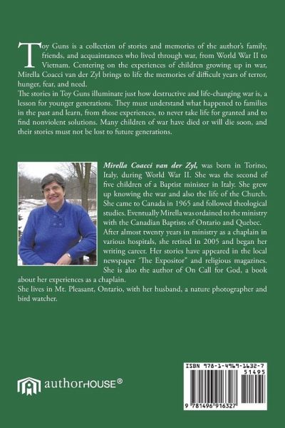 Toy Guns is a collection of stories and memories of the author's family, friends, and acquaintances who lived through war, from World War II to Vietnam. Centering on the experiences of children growing up in war, Mirella Coacci van der Zyl brings to life the memories of difficult years of terror, hunger, fear, and need. The stories in Toy Guns illuminate just how destructive and life-changing war is, a lesson for younger generations. They must understand what happened to families in the past and learn, from those experiences, to never take life for granted and to find nonviolent solutions. Many children of war have died or will die soon, and their stories must not be lost to future generations.