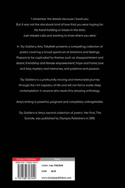 'I remember the details because I loved you. But it was not the storybook kind of love that you were hoping for. No hand-holding or kisses in the dark; Just missed calls and wanting to know where you were.' In Toy Soldiers, Amy Tollyfield presents a compelling collection of poetry covering a broad spectrum of emotions and feelings. Prepare to be captivated by themes such as disappointment and desire; friendship and female empowerment; hope and home; love and loss; mystery and memories, and patience and passion. Toy Soldiers is a profoundly moving and memorable journey through the rich tapestry of life and will not fail to evoke deep contemplation in anyone who reads this amazing anthology. Amy's writing is powerful, poignant and completely unforgettable. Toy Soldiers is Amy's second collection of poetry. Her first, The Suicide, was published by Olympia Publishers in 2018.