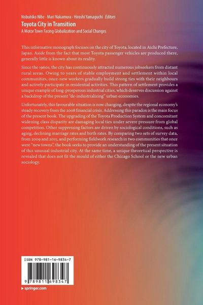 Unfortunately, this favourable situation is now changing, despite the regional economy's steady recovery from the 2008 financial crisis. Addressing this paradox is the main focus of the present book. The upgrading of the Toyota Production System and concomitant widening classdisparity are damaging local ties under severe pressure from global competition. Other suppressing factors are driven by sociological conditions, such as aging, declining marriage rates and birth rates. By comparing two sets of survey data, from 2009 and 2015, and performing fieldwork research in two communities that once were "new towns", the book seeks to provide an understanding of the present situation of this unusual industrial city. At the same time, a unique theoretical perspective is revealed that does not fit the mould of either the Chicago School or the new urban sociology.