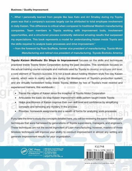 ...What I personally learned from people like Isao Kato and Art Smalley during my Toyota years was that a company's success largely can be attributed to total employee involvement in daily Kaizen. This difference is critical when compared to traditional Western manufacturing companies. Team members in Toyota working with improvement tools, involvement opportunities, and a structured process constantly delivered amazing results that surpassed my expectations. This book represents a model for understanding Kaizen inside Toyota and the skills required to analyze basic processes and drive improvement.
