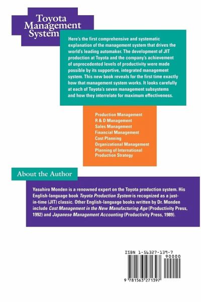 Here is the first comprehensive and systematic explanation of the management system that drives the world's leading automaker. The development of JIT production at Toyota and the company's achievement of unprecedented levels of productivity were made possible by its supportive, integrated management system. This book reveals for the first time exactly how that management system works. It looks carefully at each of Toyota's seven management subsystems and how they work as an integrated whole.