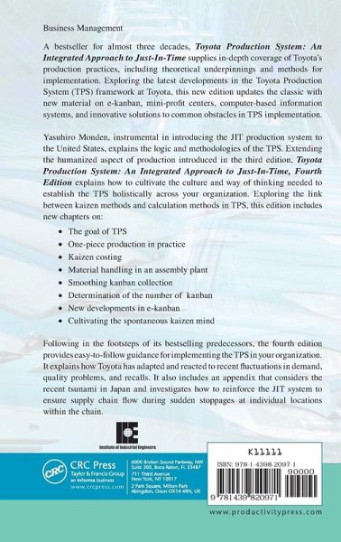 Covers the framework of Toyota Production System (TPS), including its theoretical underpinnings as well as pragmatic information on how it is implemented. This work presents the developments in TPS at Toyota. It focuses on electronic Kanban systems, computer-based information systems, and cellular manufacturing systems versus conveyor lines.