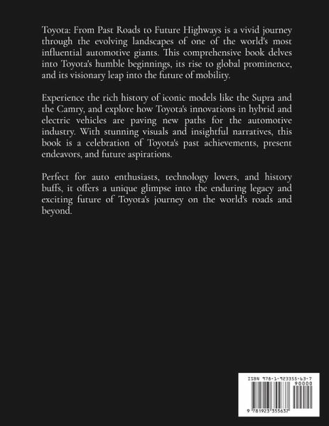 Toyota: From Past Roads to Future Highways is a vivid journey through the evolving landscapes of one of the world's most influential automotive giants. This comprehensive book delves into Toyota's humble beginnings, its rise to global prominence, and its visionary leap into the future of mobility. Experience the rich history of iconic models like the Supra and the Camry, and explore how Toyota's innovations in hybrid and electric vehicles are paving new paths for the automotive industry. With stunning visuals and insightful narratives, this book is a celebration of Toyota's past achievements, present endeavors, and future aspirations. Perfect for auto enthusiasts, technology lovers, and history buffs, it offers a unique glimpse into the enduring legacy and exciting future of Toyota's journey on the world's roads and beyond.
