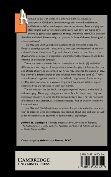 Anything to do with children's entertainment is a source of controversy: children's television programmes, musical preferences, and leisure activities are frequent sources of debate. Toys and play are often singled out for attention, particularly war toys, sex-typed toys, and video games with aggressive themes. Are these harmful to children? Are they addictive? Alternatively, can parents facilitate children's learning with educational toys? Toys, Play, and Child Development explores these and other questions. Parental attitudes and reactions towards war toys are described, as are the children's views themselves. Toys and play are shown to contribute to the development of language, imagination, and intellectual achievement and to be effective in child psychotherapy.