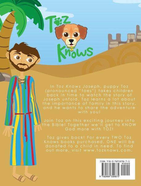 In Toz Knows Joseph, puppy Toz (pronounced "toes") takes children back in time to watch the story of Joseph unfold. Toz learns a lot about the importance of family in this story, and he wants to share the adventure with you! Join Toz on this exciting journey into the Bible! Together we'll get to KNOW God more with Toz! Toz gives back! For every TWO Toz Knows books purchased, ONE is donated to a child in need. To find out more, visit www.tozknows.com.