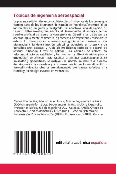 La presente edición tiene como objeto discutir algunos de los temas que forman parte de los programas de estudio de Ingeniería Aeroespacial en los niveles de pregrado y postgrado. Se construye una definición de Espacio Ultraterrestre, se estudia el lanzamiento al espacio de un satélite artificial así como la trayectoria de Oberth y su velocidad de ascenso; igualmente es descrita la geometría de trayectorias espaciales y órbitas. Las ecuaciones diferenciales que gobiernan el movimiento son planteadas y la determinación orbital es abordada en presencia de perturbaciones externas y ruido de mediciones incluido el control de actitud utilizando filtros de Kalman. Los cálculos de enlaces en telecomunicaciones satelitales y los parámetros Alto-Azimutales para la orientación de antenas hacia satélites artificiales geoestacionarios se presentan y ejemplifican. Se incluye una disertación relativa al proceso de reingreso a la atmósfera y sus consecuencias en lo aerodinámico y termodinámico.La obra es complementada con anexos referidos a la ciencia y tecnología espacial en Venezuela.