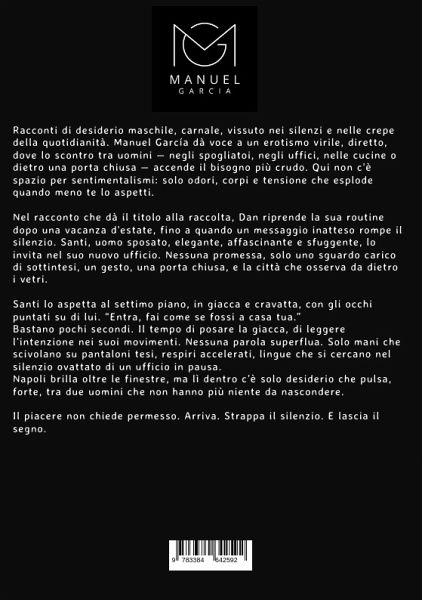 Racconti di desiderio maschile, carnale, vissuto nei silenzi e nelle crepe della quotidianità. Manuel García dà voce a un erotismo virile, diretto, dove lo scontro tra uomini - negli spogliatoi, negli uffici, nelle cucine o dietro una porta chiusa - accende il bisogno più crudo. Qui non c'è spazio per sentimentalismi: solo odori, corpi e tensione che esplode quando meno te lo aspetti.Nel racconto che dà il titolo alla raccolta, Dan riprende la sua routine dopo una vacanza d'estate, fino a quando un messaggio inatteso rompe il silenzio. Santi, uomo sposato, elegante, affascinante e sfuggente, lo invita nel suo nuovo ufficio. Nessuna promessa, solo uno sguardo carico di sottintesi, un gesto, una porta chiusa, e la città che osserva da dietro i vetri.Santi lo aspetta al settimo piano, in giacca e cravatta, con gli occhi puntati su di lui. "Entra, fai come se fossi a casa tua."Bastano pochi secondi. Il tempo di posare la giacca, di leggere l'intenzione nei suoi movimenti. Nessuna parola superflua. Solo mani che scivolano su pantaloni tesi, respiri accelerati, lingue che si cercano nel silenzio ovattato di un ufficio in pausa.Napoli brilla oltre le finestre, ma lì dentro c'è solo desiderio che pulsa, forte, tra due uomini che non hanno più niente da nascondere.Il piacere non chiede permesso. Arriva. Strappa il silenzio. E lascia il segno.