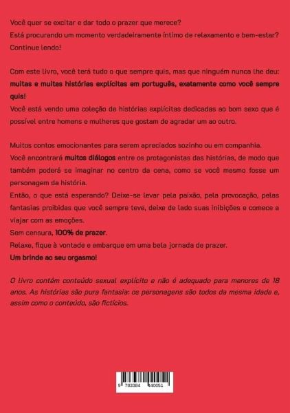 Você quer se excitar e dar todo o prazer que merece?Está procurando um momento verdadeiramente íntimo de relaxamento e bem-estar?Então continue lendo!Com este livro, você terá tudo o que sempre quis e que ninguém nunca lhe deu: muitas e muitas histórias explícitas em português, exatamente como você sempre quis!Você tem diante de si uma coleção de histórias explícitas dedicadas ao bom sexo que é possível entre homens e mulheres que gostam de agradar um ao outro. Muitos contos excitantes para experimentar sozinho ou acompanhado.Você encontrará muitos diálogos entre os protagonistas das histórias, de modo que também poderá se imaginar no centro da cena, como se você mesmo fosse um personagem da história.Então, o que está esperando? Deixe-se levar pela paixão, pela provocação, pelas fantasias proibidas que você sempre teve, deixe de lado suas inibições e comece a viajar com as emoções.Sem censura, 100% de prazer.Relaxe, fique à vontade e embarque em uma bela jornada de prazer.Um brinde ao seu orgasmo!
