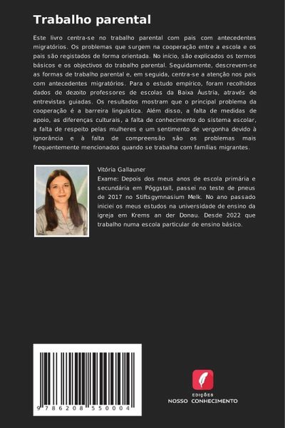 Este livro centra-se no trabalho parental com pais com antecedentes migratórios. Os problemas que surgem na cooperação entre a escola e os pais são registados de forma orientada. No início, são explicados os termos básicos e os objectivos do trabalho parental. Seguidamente, descrevem-se as formas de trabalho parental e, em seguida, centra-se a atenção nos pais com antecedentes migratórios. Para o estudo empírico, foram recolhidos dados de dezoito professores de escolas da Baixa Áustria, através de entrevistas guiadas. Os resultados mostram que o principal problema da cooperação é a barreira linguística. Além disso, a falta de medidas de apoio, as diferenças culturais, a falta de conhecimento do sistema escolar, a falta de respeito pelas mulheres e um sentimento de vergonha devido à ignorância e à falta de compreensão são os problemas mais frequentemente mencionados quando se trabalha com famílias migrantes.