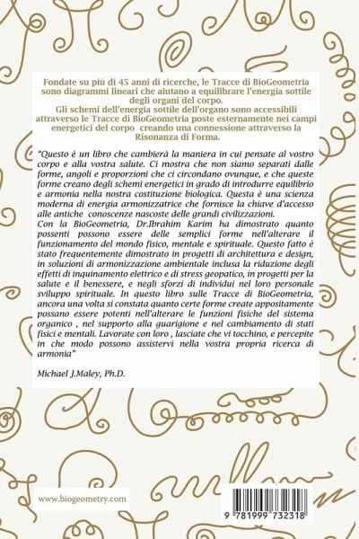 Fondate su più di 45 anni di ricerche, le Tracce di BioGeometria sono diagrammi lineari che aiutano a equilibrare l’energia sottile degli organi del corpo. Gli schemi dell’energia sottile dell’organo sono accessibili attraverso le Tracce di BioGeometria poste esternamente nei campi energetici del corpo creando una connessione attraverso la Risonanza di Forma. "Questo è un libro che cambierà la maniera in cui pensate al vostro corpo e alla vostra salute. Ci mostra che non siamo separati dalle forme, angoli e proporzioni che ci circondano ovunque, e che queste forme creano degli schemi energetici in grado di introdurre equilibrio e armonia nella nostra costituzione biologica. Questa è una scienza moderna di energia armonizzatrice che fornisce la chiave d’accesso alle antiche conoscenze nascoste delle grandi civilizzazioni. Con la BioGeometria, Dr.Ibrahim Karim ha dimostrato quanto possenti possono essere delle semplici forme nell’alterare il funzionamento del mondo fisico, mentale e spirituale. Questo fatto è stato frequentemente dimostrato in progetti di architettura e design, in soluzioni di armonizzazione ambientale inclusa la riduzione degli effetti di inquinamento elettrico e di stress geopatico, in progetti per la salute e il benessere, e negli sforzi di individui nel loro personale sviluppo spirituale. In questo libro sulle Tracce di BioGeometria, ancora una volta si constata quanto certe forme create appositamente possano essere potenti nell’alterare le funzioni fisiche del sistema organico, nel supporto alla guarigione e nel cambiamento di stati fisici e mentali. Lavorate con loro, lasciate che vi tocchino, e percepite in che modo possono assistervi nella vostra propria ricerca di armonia." Michael J.Maley, Ph.D. Istruttore di BioGeometria