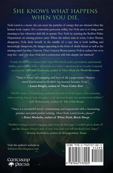 She knows what happens when you die Nola Lantry is a tracist: she can sense the particles of energy that are released when the human body expires. It's a somewhat gruesome ability, and one of questionable value, but Nola tries her best to use it to bring a little more meaning and excitement to her otherwise drab life in upstate New York. She has assisted the Redfort Police Department on missing persons cases, and while most of the cops have little respect for her work, Nola is determined to prove her worth. The chance to do just that comes when the richest man in town, Culver Bryant, disappears. Suddenly Nola finds herself in the middle of a case that is both baffling and increasingly dangerous, the danger appearing in the form of death threats as well as the missing man's brother, Grayson. Does Grayson Bryant pursue Nola to seduce her or to stop her--and why does Nola feel a connection with him despite her mistrust?