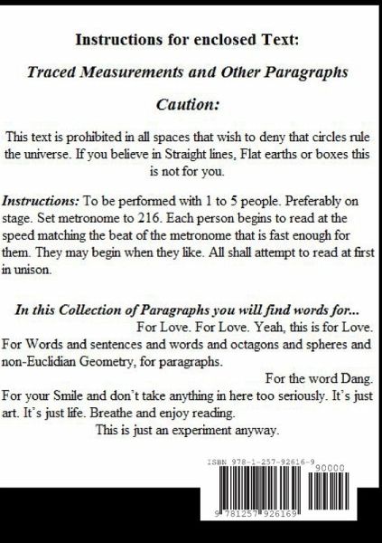 Instructions for enclosed Text: Traced Measurements and Other Paragraphs Caution: This text is prohibited in all spaces that wish to deny that circles rule the universe. If you believe in Straight lines, Flat earths or boxes this is not for you. Instructions: To be performed with 1 to 5 people. Preferably on stage. Set metronome to 216. Each person begins to read at the speed matching the beat of the metronome that is fast enough for them. They may begin when they like. All shall attempt to read at first in unison. In this Collection of Paragraphs you will find words for... For Love. For Love. Yeah, this is for Love. For Words and sentences and words and octagons and spheres and non-Euclidian Geometry, for paragraphs. For the word Dang. For your Smile and don't take anything in here too seriously. It's just art. It's just life. Breathe and enjoy reading. This is just an experiment anyway.