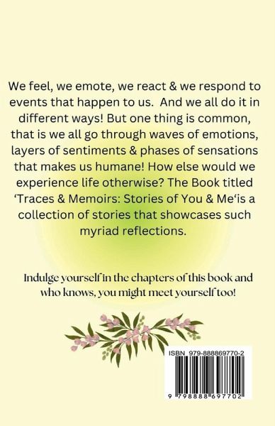 We feel, we emote, we react & we respond to events that happen to us. And we all do it in different ways! But one thing is common, that is, we all go through waves of emotions, layers of sentiments & phases of sensations that make us humane! How else would we experience life otherwise? The Book titled ‘Traces & Memoirs: Stories of You & Me' is a collection of stories that showcases such myriad reflections. Twenty-six fictional stories have been arranged like pearls in a garland, where the emotions are arranged in alphabetical order & where the protagonists make choices that impact their life. Indulge yourself in the chapters of this book and who knows, you might meet yourself too!