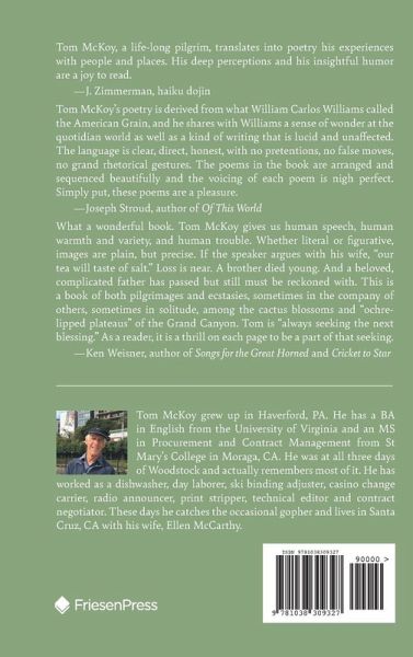 This book of poems conveys experiences in the life of the poet, with occasional conjuring through the eyes of other beings. The poems range from the intimate to the universal. Wonder, grief and humor intertwine throughout the book, sometimes all in a single piece. The pilgrimage of the title refers to both specific rambles and the long journey through this precious world. The poet hopes the reader finds recognition, surprise and pleasure in these pages. Tom McKoy's poetry is derived from what William Carlos Williams called the American Grain, and he shares with Williams a sense of wonder at the quotidian world as well as a kind of writing that is lucid and unaffected. The language is clear, direct, honest, with no pretentions, no false moves, no grand rhetorical gestures. The poems in the book are arranged and sequenced beautifully and the voicing of each poem is nigh perfect. Simply put, these poems are a pleasure. -Joseph Stroud, author of Of This World