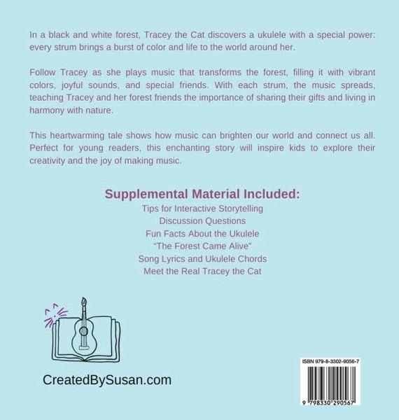 In a black-and-white forest, Tracey the Cat discovers a ukulele with a special power: every strum brings a burst of color and life to the world around her. Follow Tracey as she plays music that transforms the forest, filling it with vibrant colors, joyful sounds, and special friends. With each strum, the music spreads, teaching Tracey and her forest friends the importance of sharing their gifts and living in harmony with nature. This heartwarming tale shows how music can brighten our world and connect us all. Perfect for young readers, this enchanting story will inspire kids to explore their creativity and the joy of making music. Supplemental Material IncludedTips for Interactive Storytelling Discussion Questions Fun Facts About the Ukulele "The Forest Came Alive" Song Lyrics and Ukulele Chords Meet the Real Tracey the Cat