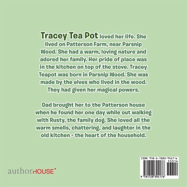 Tracey Tea Pot loved her life. She lived on Patterson Farm, near Parsnip Wood. She had a warm, loving nature and adored her family. Her pride of place was in the kitchen on top of the stove. Tracey Teapot was born in Parsnip Wood. She was made by the elves who lived in the wood. They had given her magical powers. Dad brought her to the Patterson house when he found her one day while out walking with Rusty, the family dog. She loved all the warm smells, chattering, and laughter in the old kitchen - the heart of the household.
