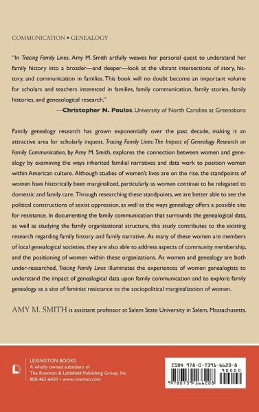 Family genealogy research has grown exponentially over the past decade, making it an area worthy of scholarly inquest. Tracing Family Lines: The Impact of Genealogy Research on Family Communication, by Amy M. Smith, explores the connection between women and genealogy by examining the ways inherited familial narratives and data work to position women within American culture.
