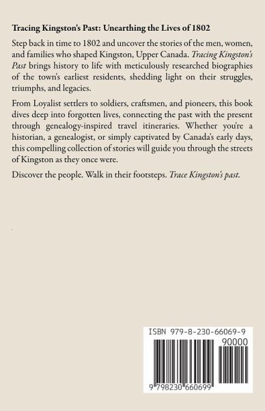 Tracing Kingston's Past: Unearthing the Lives of 1802 Step back in time to 1802 and uncover the stories of the men, women, and families who shaped Kingston, Upper Canada. Tracing Kingston's Past brings history to life with meticulously researched biographies of the town's earliest residents, shedding light on their struggles, triumphs, and legacies. From Loyalist settlers to soldiers, craftsmen, and pioneers, this book dives deep into forgotten lives, connecting the past with the present through genealogy-inspired travel itineraries. Whether you're a historian, a genealogist, or simply captivated by Canada's early days, this compelling collection of stories will guide you through the streets of Kingston as they once were. Discover the people. Walk in their footsteps. Trace Kingston's past.
