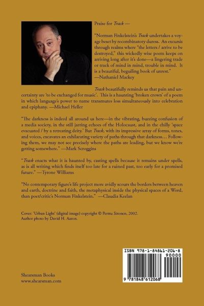 Track is a book-length poem, originally released in the USA in 3 volumes by Spuyten Divil. Praise for the work includes - "Norman Finkelstein's Track undertakes a voyage beset by recombinatory duress. An excursis through realms where "the letters / arrive to be destroyed," this wickedly wise poem keeps on arriving long after it's done-a lingering trade or track of mind in mind, trouble in mind. It is a beautiful, beguiling book of unrest." -Nathaniel Mackey "Track beautifully reminds us that pain and uncertainty are 'to be exchanged for music'. This is a haunting 'broken crown' of a poem in which language's power to name transmutes loss simultaneously into celebration and epiphany. -Michael Heller "The cumulative sense and soul of so many passages ventured, so many thresholds crossed, shed a perfect radiance. In Track, the light is solid." -Donald Revell "Paradise is the track we're following in this poem, the spoor we're on, the prey we're tracking... Finkelstein has created an amazing new kind of poem - as tensile as it is frangible, as spiritually reviving as it is philosophically zeroing." -Peter O'Leary