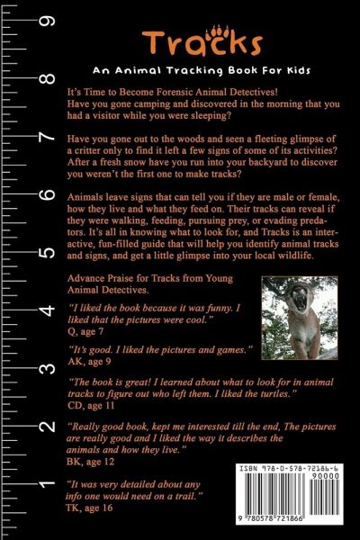 It's Time to Become Forensic Animal Detectives! Have you gone camping and discovered in the morning that you had a visitor while you were sleeping? Have you gone out to the woods and seen a fleeting glimpse of a critter only to find it left a few signs of some of its activities? After a fresh snow have you run into your backyard to discover you weren't the first one to make tracks? Animals leave signs that can tell you if they are male or female, how they live and what they feed on. Their tracks can reveal if they were walking, feeding, pursuing prey, or evading predators. It's all in knowing what to look for, and Tracks is an interactive, fun-filled guide that will help you identify animal tracks and signs, and get a little glimpse into your local wildlife. Advance Praise for Tracks from Young Animal Detectives "I liked the book because it was funny. I liked that the pictures were cool." Q, age 7 "It's good. I liked the pictures and games." AK, age 9 "The book is great! I learned about what to look for in animal tracks to figure out who left them. I liked the turtles." CD, age 11 "Really good book, kept me interested till the end, The pictures are really good and I liked the way it describes the animals and how they live." BK, age 12 "I think the book explains animal tracks well. Lots of interesting details, like that during hibernation bears recycle their poop into protein." RD, age 13 "I was very informative and I learned a lot about animals and their tracks that I didn't know before. It was interesting to learn how animal mothers do nasty things to protect their offspring." SK, age 14