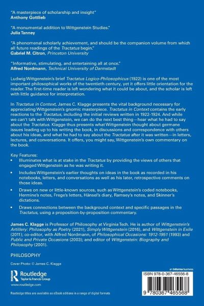 "Klagge's Tractatus in Context provides a personalised tour of Wittgenstein's first published work through a treasure trove of material - including diary entries, correspondence, related philosophical discussions, historical context, anecdotes, and comparisons with earlier drafts, later writings, the German-English translations, and, finally, its reception in the philosophical community. Throughout this journey, Klagge guides the reader through the material with his own expertise and wit, from his careful elucidation of the technical mathematical material to the more mystical passages at the end. Documenting every step with extensive footnotes, Klagge has produced what will become required research material for upper division undergraduate and graduate students and sought after by scholars, teachers, students and admirers of Wittgenstein. 45 years in the making, this book is a monumental addition to Wittgenstein Studies."