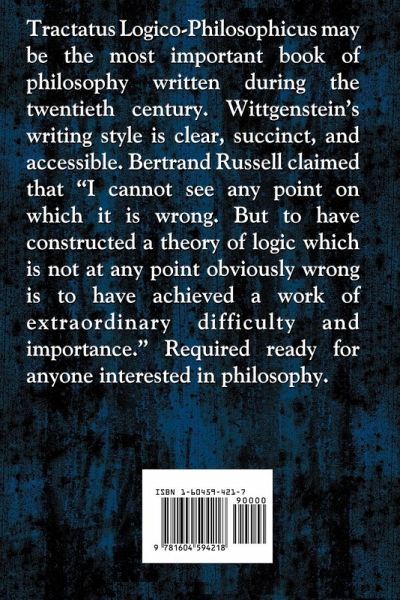 Tractatus Logico-Philosophicus may be the most important book of philosophy written during the twentieth century. Wittgenstein's writing style is clear, succinct, and accessible. Bertrand Russell claimed that "I cannot see any point on which it is wrong. But to have constructed a theory of logic which is not at any point obviously wrong is to have achieved a work of extraordinary difficulty and importance." Required ready for anyone interested in philosophy.