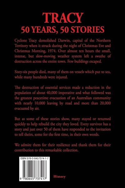 Cyclone Tracy demolished Darwin, capital of the Northern Territory when it struck during the night of Christmas Eve and Christmas Morning, 1974. Over almost ten hours the small, intense, but slow-moving weather system left a swathe of destruction across the entire town. Few buildings escaped. Sixty-six people died, many of them on vessels which put to sea, while many hundreds were injured. The destruction of essential services made a reduction in the population of about 40,000 imperative and what followed was the greatest peacetime evacuation of an Australian community with nearly 10,000 leaving by road and more than 20,000 evacuated by air. But as some of these stories show, many stayed or returned quickly to help rebuild the city they loved. Every survivor has a story and just over 50 of them have responded to the invitation to tell theirs, some for the first time, in their own words. We admire them for their resilience and thank them for their contribution to this remarkable collection.
