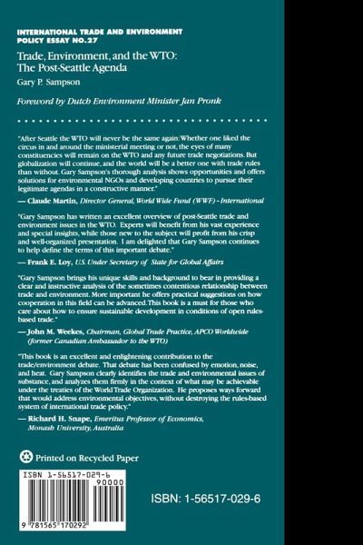 What role should international trade rules and the World Trade Organization (WTO) play in the protection of the environment? While many environmentalists argue that trade rules and procedures must be made more "green," many trade proponents fear that the international trading system will be undermined by extreme demands of environmentalists. In this essay, Gary Sampson scrutinizes these contending views and assesses the effects of trade liberalization on the environment; the role of the WTO's dispute settlement mechanism; the potential impact of WTO rules, including those dealing with production processes; and the relationship that should exist between the WTO and specific multilateral environmental agreements. In his discussion of these issues, Sampson puts forward a priority agenda for trade and environmental ministers and proposes ways to enhance the WTO's environmental protection role and strengthen the trading system at the same time.