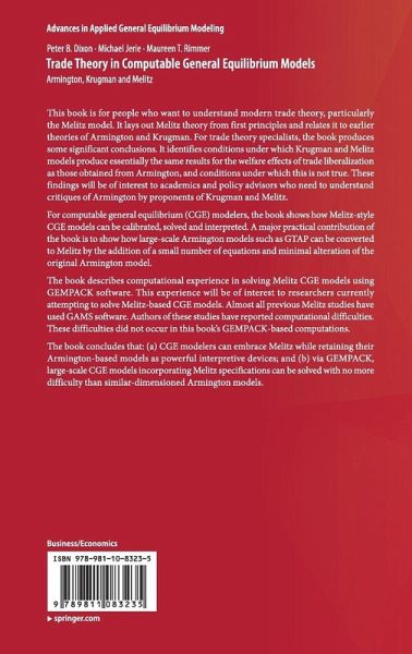 Chapter 1. Introduction: What's in the Book and How to Read It.- Chapter 2. Armington, Krugman and Melitz as Special Cases of an Encompassing Model.- Chapter 3. Optimality in the Armington, Krugman and Melitz Models.- Chapter 4. Calibration and Parameter Estimation for a Melitz Sector in a CGE Model.- Chapter 5. Melitz equals Armington Plus Endogenous Productivity and Preferences.- Chapter 6. Illustrative GEMPACK Computations in a General Equilibrium Model with Melitz Sectors.- Chapter 7. Converting an Armington Model into a Melitz Model: Giving Melitz Sectors to GTAP.- Chapter 8. Summary and Concluding Remarks.
