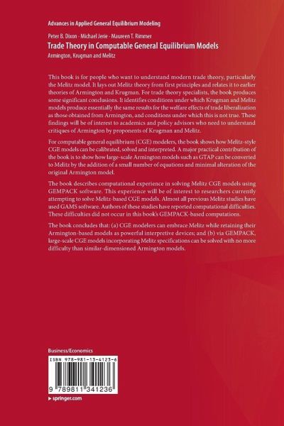 Chapter 1. Introduction: What's in the Book and How to Read It.- Chapter 2. Armington, Krugman and Melitz as Special Cases of an Encompassing Model.- Chapter 3. Optimality in the Armington, Krugman and Melitz Models.- Chapter 4. Calibration and Parameter Estimation for a Melitz Sector in a CGE Model.- Chapter 5. Melitz equals Armington Plus Endogenous Productivity and Preferences.- Chapter 6. Illustrative GEMPACK Computations in a General Equilibrium Model with Melitz Sectors.- Chapter 7. Converting an Armington Model into a Melitz Model: Giving Melitz Sectors to GTAP.- Chapter 8. Summary and Concluding Remarks.