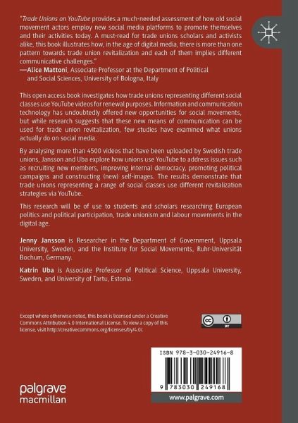 This open access book investigates how trade unions representing different social classes use YouTube videos for renewal purposes. Information and communication technology has undoubtedly offered new opportunities for social movements, but while research suggests that these new means of communication can be used for trade union revitalization, few studies have examined what unions actually do on social media.