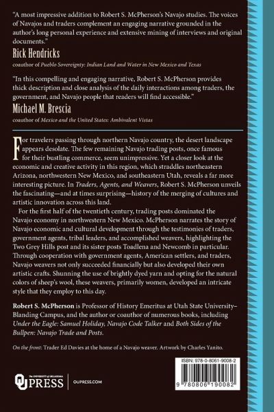 For travelers passing through northern Navajo country, the desert landscape appears desolate. The few remaining Navajo trading posts, once famous for their bustling commerce, seem unimpressive. Yet a closer look at the economic and creative activity in this region, which straddles northeastern Arizona, northwestern New Mexico, and southeastern Utah, belies a far more interesting picture. In Traders, Agents, and Weavers, Robert S. McPherson unveils the fascinating-and at times surprising-history of the merging of cultures and artistic innovation across this land. McPherson, the author of numerous books on Navajo and southwestern history, narrates here the story of Navajo economic and cultural development through the testimonies of traders, government agents, tribal leaders, and accomplished weavers. For the first half of the twentieth century, trading posts dominated the Navajo economy in northwestern New Mexico. McPherson highlights the Two Grey Hills post and its sister posts Toadlena and Newcomb, which encouraged excellence among weavers and sold high-quality rugs and blankets. Parallel to the success of the trading industry was the establishment of the Northern Navajo or Shiprock Agency and Boarding School. The author explains the pivotal influence on the area of the agency's stern and controversial founder, William T. Shelton, known by Navajos as Tall Leader. Through cooperation with government agents, American settlers, and traders, Navajo weavers not only succeeded financially but also developed their own artistic crafts. Shunning the use of brightly dyed yarn and opting for the natural colors of sheep's wool, these weavers, primarily women, developed an intricate style that has few rivals. Eventually, economic shifts, including oil drilling and livestock reduction, eroded the traditional Navajo way of life and led to the collapse of the trading post system. Nonetheless, as McPherson emphasizes, Navajo weavers have maintained their distinctive style and method of production to this day.