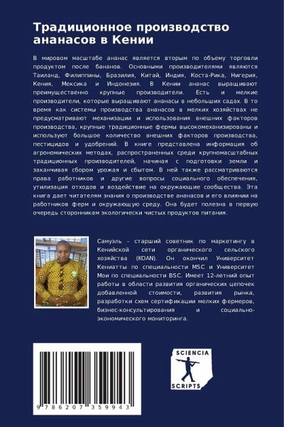 V mirowom masshtabe ananas qwlqetsq wtorym po ob#emu torgowli produktom posle bananow. Osnownymi proizwoditelqmi qwlqütsq Tailand, Filippiny, Braziliq, Kitaj, Indiq, Kosta-Rika, Nigeriq, Keniq, Mexika i Indoneziq. V Kenii ananas wyraschiwaüt preimuschestwenno krupnye proizwoditeli. Est' i melkie proizwoditeli, kotorye wyraschiwaüt ananasy w nebol'shih sadah. V to wremq kak sistemy proizwodstwa ananasow w melkih hozqjstwah ne predusmatriwaüt mehanizacii i ispol'zowaniq wneshnih faktorow proizwodstwa, krupnye tradicionnye fermy wysokomehanizirowany i ispol'zuüt bol'shoe kolichestwo wneshnih faktorow proizwodstwa, pesticidow i udobrenij. V knige predstawlena informaciq ob agronomicheskih metodah, rasprostranennyh sredi krupnomasshtabnyh tradicionnyh proizwoditelej, nachinaq s podgotowki zemli i zakanchiwaq sborom urozhaq i sbytom. V nej takzhe rassmatriwaütsq prawa rabotnikow i drugie woprosy social'nogo obespecheniq, utilizaciq othodow i wozdejstwie na okruzhaüschie soobschestwa. Jeta kniga daet chitatelqm znaniq o proizwodstwe ananasow i ego wliqnii na rabotnikow ferm i okruzhaüschuü sredu. Ona budet polezna w perwuü ochered' storonnikam äkologicheski chistyh produktow pitaniq.