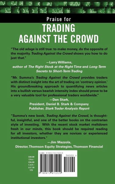 Efficient market theorists contend that markets are random and thus not predictable. With the publication of Trading Against theCrowd, however, noted author, economist, and professional trader John Summa convincingly shows that investor sentiment can be incorporated into profitable stock and stock market trading systems. In this groundbreaking book, Summa explains how to use popular gauges of crowd psychology, such as put/call ratios, option-implied volatility, short sales, investor surveys, and advisory opinion to trade against, or contrary to, prevailing market sentiment. He also makes compelling arguments against the efficient markets hypothesis with the presentation of his own quantitative weekly bear and bull news-flow intensity indices, which he builds from news scans. This data series, and other popular measures of crowd psychology, are processed through custom indicators that are programmed into profitable trading systems, such as Squeeze Play I & II, Tsunami Sentiment Wave, and the Fourth Estate. Trading Against the Crowd is the first book to provide a comprehensive assessment of investor crowd psychology, offering valuable market timing tools and trading techniques, including: MetaStock and Trade Station system and custom indicator code; comparative statistical studies of CBOE, OEX, and equity-only put/call ratios; straightforward instructions for combining price triggers with sentiment indicators; a practical guide to understanding put/call ratios, short sales, investor surveys, newsletter opinion, and stock market news-flow intensity; how to use LEAP options as trading vehicles to avoid use of stop loss orders; use of put/call ratios for trading the Treasury bond futures market; and test results and evaluation of trading system performance. Many of today's professional money managers rely on investor sentiment for improved market timing. They know that at extremes of market sentiment, markets tend to be the most predictable. Trading Against the Crowd shows how you can begin to profit from these short- to medium-term sentiment waves generated by the actions of the speculative crowd. Put into practice powerful sentiment data using thoroughly back-tested trading systems, and rise above the herd mentality of the investor crowd, where potentially large profits await.