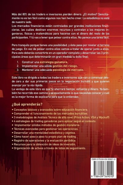 Si siempre has querido aprender a invertir en bolsa pero nunca supiste cómo, entonces sigue leyendo porque este libro ha sido escrito para ti. Invertir en los mercados bursátiles no es fácil, pero puedes aprender incluso si no tienes ningún conocimiento previo. Para ello sólo necesitas el recurso adecuado: TRADING E INVERSIÓN PARA PRINCIPIANTES. Rubén Villahermosa, bestseller en Amazon y trader independiente, ha creado este revolucionario libro con el que podrás aprender desde cero todo lo que necesitas con un lenguaje sencillo alejado de tecnicismos. En este libro aprenderás...A mejorar tu economía personal con Educación financiera. Las teorías financieras más empleadas. Los principales productos de inversión. TODO el argot financiero, explicado. Los fundamentos del Análisis Técnico. 3 Metodologías de Análisis Técnico. 4 estrategias de Trading ganadoras. Conceptos clave de Gestión del Riesgo. (IMPRESIONANTE) Gestión emocional, sesgos cognitivos. Cómo desarrollar un plan de trading paso a paso. A registrar adecuadamente y revisar tus operaciones. Y a cómo empezar a dar tus primeros pasos. Y mucho más...! No dejes pasar más tiempo, COMPRA EL LIBRO AHORA y descubre cómo tú también puedes ganar dinero en bolsa. ¿Quieres ganar dinero operando en bolsa? En este libro te cuento todo lo que necesitas para operar en los mercados financieros y comenzar a obtener rentabilidad de tus ahorros. Aprende sobre Mercados bursátilesDescubrirás todos los conocimientos necesarios para entender cómo funcionan los mercados financieros: Características de los mercados Principales productos de inversión Conceptos fundamentales Argot financiero Aprende sobre Análisis Técnico Estudiaremos 3 metodologías de Análisis Técnico cuya lógica subyacente se basa en el estudio de la interacción entre la oferta y la demanda: Price Action Mediante el estudio del Price Action aprenderemos a identificar el contexto con el objetivo de seleccionar el tipo de operativa que mejor se adapte a él. Como sabemos, los mercados sólo pueden estar en dos estados: en rango y en tendencia. Volume Spread Analysis Gracias las distintas herramientas que nos ofrece la metodología VSA podemos ser capaces de identificar la intervención o ausencia de los grandes operadores: cuándo están entrando o saliendo, así como el grado de interés y participación que muestran en los movimientos. Metodología Wyckoff El método Wyckoff se centra en el estudio de los rangos. Trata de dilucidar qué fuerza tiene el control y hacia dónde es más probable que sea el próximo movimiento. Además, gracias a los eventos y fases que lo componen nos ofrece un contexto y mapa de ruta mucho más definidos sobre qué esperar que haga el mercado.