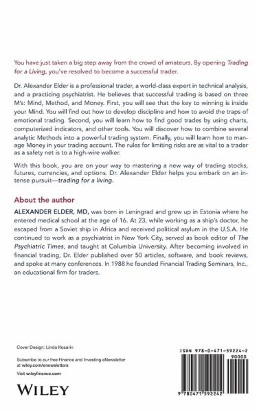 About the author ALEXANDER ELDER, MD, was born in Leningrad and grew up in Estonia where he entered medical school at the age of 16. At 23, while working as a ship's doctor, he escaped from a Soviet ship in Africa and received political asylum in the U.S.A. He continued to work as a psychiatrist in New York City, served as book editor of The Psychiatric Times, and taught at Columbia University. After becoming involved in financial trading, Dr. Elder published over 50 articles, software, and book reviews, and spoke at many conferences. In 1988 he founded Financial Trading Seminars, Inc., an educational firm for traders.