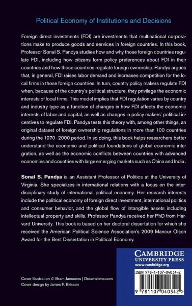 This book is the first comprehensive study of foreign direct investment (FDI) liberalization. Political economy FDI research has long focused on how host-country politics influence the supply of FDI, or how firms choose to invest. By contrast, this book focuses on the politics of FDI demand: the sources of citizens' preferences for FDI inflows and countries' foreign ownership restrictions. Professor Sonal S. Pandya's theory of FDI regulation identifies how FDI redistributes income within host countries, raises local wages, and creates competition for local firms. Empirical tests also emphasize the central role of multinational cooperations' productive assets in shaping the politics of FDI. These tests feature an original dataset of annual country-industry foreign ownership regulations that spans more than one hundred countries during the period 1970-2000. This book highlights the economic and political foundations of global economic integration and supplies the tools to understand the growing economic conflicts between advanced economics and large emerging markets such as China and India.