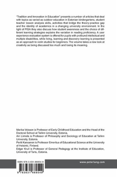 "Tradition and Innovation in Education" presents a number of articles that deal with topics as varied as outdoor education in Estonian kindergartens, student teacher lesson analysis skills, activities that bridge the theory-practice gap and the identity of academics in a changing university environment. In the light of PISA they also discuss how student awareness and the choice of different learning strategies explains the variation in reading proficiency. A user experience evaluation system is offered for pupils with profound intellectual and multiple disabilities, while living, learning and discovery learning is presented as an approach to violin studies for beginners. The volume takes a new look at creativity as being discussed too much and losing its meaning.