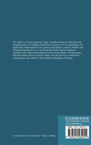 The subject of Vassos Argyrou's study is modernization, as reflected in the changing nature of wedding celebrations in Cyprus over two generations. He argues that modernization is not a secular, progressive process that remodels the life of a society, ironing out local differences. Rather, it is an idiom--a legitimizing discourse--in which Cypriots represent, and contest, relationships among social classes, old and young, men and women, city folk and villagers. At the same time, by involving modernization, they are submitting to foreign standards, and accepting the symbolic domination of Europe.