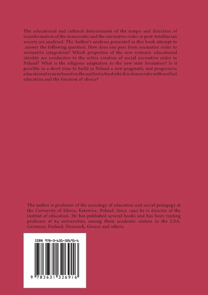 The educational and cultural determinants of the tempo and direction of transformation of the democratic and the normative order in post-totalitarian society are analysed. The author's analyses presented in this book attempt to answer the following question: How does one pass from normative order to normative integration? Which properties of the new systemic educational identity are conductive to the active creation of social normative order in Poland? What is the religious adaptation to the new state formation? Is it possible in a short time to build in Poland a new pragmatic and progressive educational system based on the unified school which is democratic with unified education and the freedom of choice?