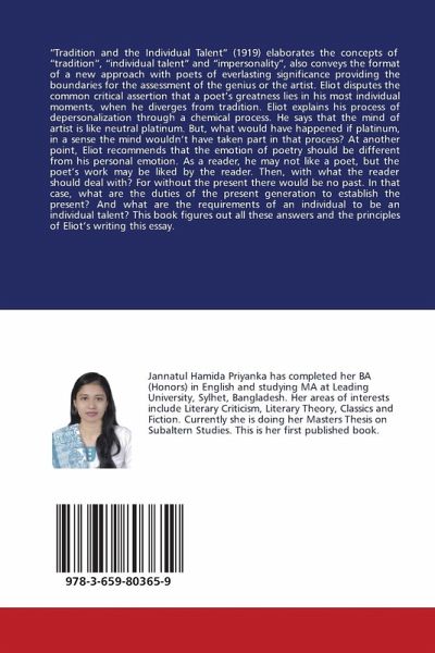 "Tradition and the Individual Talent" (1919) elaborates the concepts of "tradition", "individual talent" and "impersonality", also conveys the format of a new approach with poets of everlasting significance providing the boundaries for the assessment of the genius or the artist. Eliot disputes the common critical assertion that a poet's greatness lies in his most individual moments, when he diverges from tradition. Eliot explains his process of depersonalization through a chemical process. He says that the mind of artist is like neutral platinum. But, what would have happened if platinum, in a sense the mind wouldn't have taken part in that process? At another point, Eliot recommends that the emotion of poetry should be different from his personal emotion. As a reader, he may not like a poet, but the poet's work may be liked by the reader. Then, with what the reader should deal with? For without the present there would be no past. In that case, what are the duties of the present generation to establish the present? And what are the requirements of an individual to be an individual talent? This book figures out all these answers and the principles of Eliot's writing this essay.