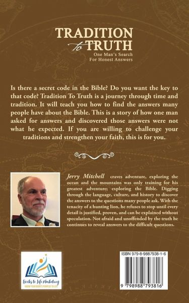 Is there a secret code in the Bible? Do you want the key to that code? Tradition To Truth is a journey through time and tradition. It will teach you how to find the answers many people have about the Bible. This is a story of how one man asked for answers and discovered those answers were not what he expected. If you are willing to challenge your traditions and strengthen your faith, this is for you.