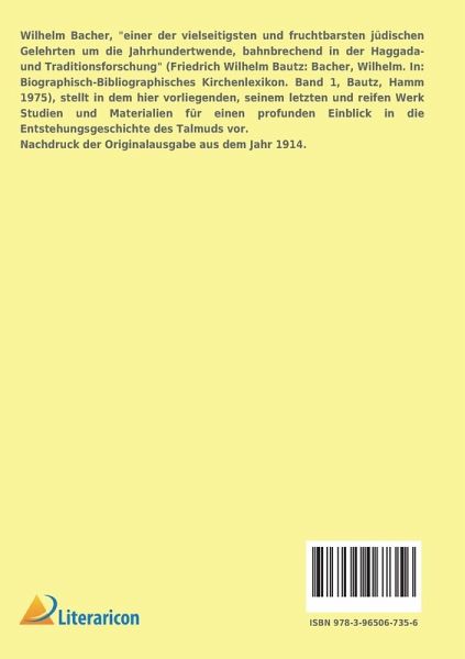 Wilhelm Bacher, "einer der vielseitigsten und fruchtbarsten jüdischen Gelehrten um die Jahrhundertwende, bahnbrechend in der Haggada- und Traditionsforschung" (Friedrich Wilhelm Bautz: Bacher, Wilhelm. In: Biographisch-Bibliographisches Kirchenlexikon. Band 1, Bautz, Hamm 1975), stellt in dem hier vorliegenden, seinem letzten und reifen Werk Studien und Materialien für einen profunden Einblick in die Entstehungsgeschichte des Talmuds vor. Nachdruck der Originalausgabe aus dem Jahr 1914.
