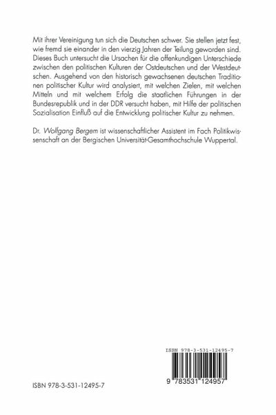 Mit ihrer Vereinigung tun sich die Deutschen schwer. Sie stellen jetzt fest, wie fremd sie einander in den vierzig Jahren der Teilung geworden sind. Dieses Buch untersucht die Ursachen für die offenkundigen Unterschiede zwischen den politischen Kulturen der Ostdeutschen und der Westdeutschen. Ausgehend von den historisch gewachsenen deutschen Traditionen politischer Kultur wird analysiert, mit welchen Zielen, mit welchen Mitteln und mit welchem Erfolg die staatlichen Führungen in der Bundesrepublik und in der DDR versucht haben, mit Hilfe der politischen Sozialisation Einfluß auf die Entwicklung politischer Kultur zu nehmen.