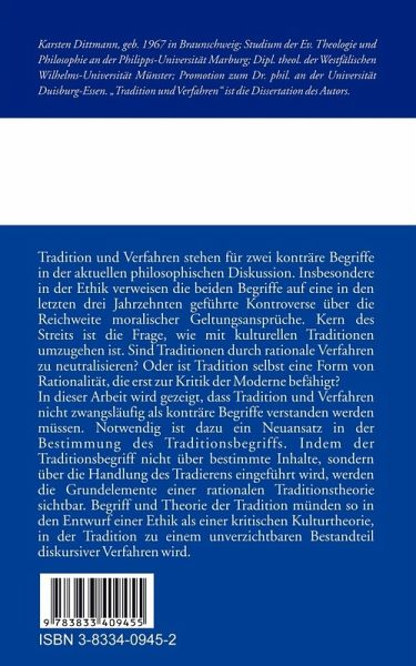 Tradition und Verfahren stehen für zwei konträre Begriffe in der aktuellen philosophischen Diskussion. Insbesondere in der Ethik verweisen die beiden Begriffe auf eine in den letzten drei Jahrzehnten geführte Kontroverse über die Reichweite moralischer Geltungsansprüche. Kern des Streits ist die Frage, wie mit kulturellen Traditionen umzugehen ist. Sind Traditionen durch rationale Verfahren zu neutralisieren? Oder ist Tradition selbst eine Form von Rationalität, die erst zur Kritik der Moderne befähigt? In dieser Arbeit wird gezeigt, dass Tradition und Verfahren nicht zwangsläufig als konträre Begriffe verstanden werden müssen. Notwendig ist dazu ein Neuansatz in der Bestimmung des Traditionsbegriffs. Indem der Traditionsbegriff nicht über bestimmte Inhalte, sondern über die Handlung des Tradierens eingeführt wird, werden die Grundelemente einer rationalen Traditionstheorie sichtbar. Begriff und Theorie der Tradition münden so in den Entwurf einer Ethik als einer kritischen Kulturtheorie, in der Tradition zu einem unverzichtbaren Bestandteil diskursiver Verfahren wird.