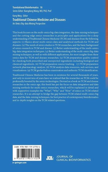 Chapter 1. Introduction to multi-omics data and analytical methods for TCM and diseases.- Chapter 2. TCM and diseases: the needs for multi-omics.- Chapter 3. TCM related multi-omics data integration techniques.- Chapter 4. TCM related multi-omics data mining techniques.- Chapter 5. TCM preparation quality control: biological and chemical ingredient analysis.- Chapter 6. TCM preparation source tracking.- Chapter 7. TCM preparation network pharmacology analysis.- Chapter 8. TCM analysis data resources, web services and visualizations.- Chapter 9. TCM geoherbalism examination and authentic TCM identification.