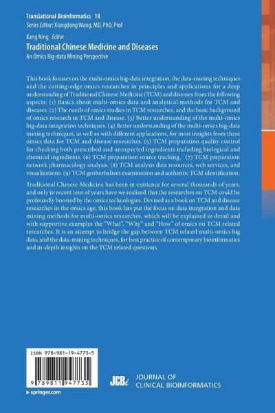 Chapter 1. Introduction to multi-omics data and analytical methods for TCM and diseases.- Chapter 2. TCM and diseases: the needs for multi-omics.- Chapter 3. TCM related multi-omics data integration techniques.- Chapter 4. TCM related multi-omics data mining techniques.- Chapter 5. TCM preparation quality control: biological and chemical ingredient analysis.- Chapter 6. TCM preparation source tracking.- Chapter 7. TCM preparation network pharmacology analysis.- Chapter 8. TCM analysis data resources, web services and visualizations.- Chapter 9. TCM geoherbalism examination and authentic TCM identification.