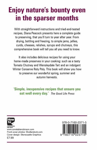 This book will show you how to preserve our wonderful spring, summer and autumn harvests, so that you can enjoy nature's bounty even in the sparser months With straightforward instructions and tried-and-tested recipes, Diana Peacock has delivered a complete guide to turn to year after year. From drying, bottling and freezing to simple jams, jellies, curds, cheeses, relishes, syrups and chutneys, this comprehensive book will tell you all you need to know about home preserving. It also includes delicious recipes for using your home-made preserves in your cooking: such as a tasty Tomato Chutney and Wensleydale Tart and an indulgent Winter Conserve Roly Poly. 'Simple, inexpensive recipes that ensure you eat well every day.' The Good Life Press