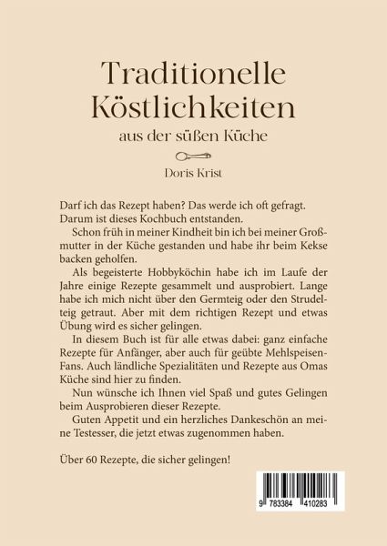 Darf ich das Rezept haben? Das werde ich oft gefragt. Darum ist dieses Kochbuch entstanden. Schon früh in meiner Kindheit bin ich bei meiner Großmutter in der Küche gestanden und habe ihr beim Kekse backen geholfen. Als begeisterte Hobbyköchin habe ich im Laufe der Jahre einige Rezepte gesammelt und ausprobiert. Lange habe ich mich nicht über den Germteig oder den Strudelteig getraut. Aber mit dem richtigen Rezept und etwas Übung wird es sicher gelingen.In diesem Buch ist für alle etwas dabei: ganz einfache Rezepte für Anfänger, aber auch für geübte Mehlspeisen-Fans. Auch ländliche Spezialitäten und Rezepte aus Omas Küche sind hier zu finden.Nun wünsche ich Ihnen viel Spaß und gutes Gelingen beim Ausprobieren dieser Rezepte.Guten Appetit und ein herzliches Dankeschön an meine Testesser, die jetzt etwas zugenommen haben.Über 60 Rezepte, die sicher gelingen!
