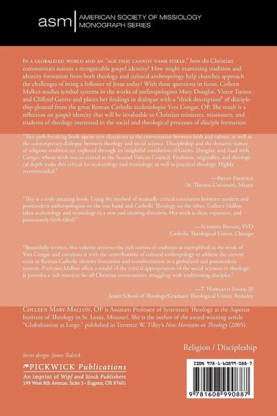 In a globalized world and an ""age that cannot name itself,"" how do Christian communities sustain a recognizable gospel identity? How might examining tradition and identity formation from both theology and cultural anthropology help churches approach the challenges of being a follower of Jesus today? With these questions in focus, Colleen Mallon studies symbol systems in the works of anthropologists Mary Douglas, Victor Turner, and Clifford Geertz and places her findings in dialogue with a ""thick description"" of discipleship gleaned from the great Roman Catholic ecclesiologist Yves Congar, OP. The result is a reflection on gospel identity that will be invaluable to Christian ministers, missioners, and students of theology interested in the social and theological processes of disciple formation.